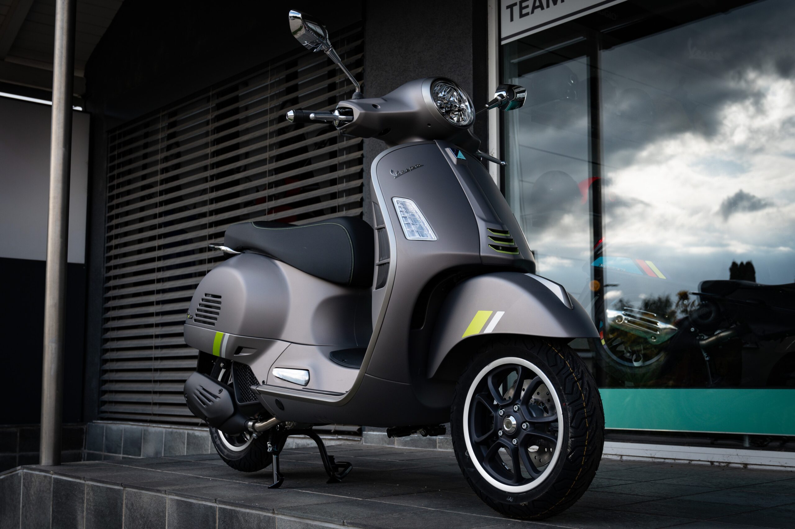 Ein einzigartiges und fesselndes Design, das die Exklusivität und technologische Innovation einer echten italienischen Ikone verkörpert. Die Vespa GTS SuperTech besticht durch glänzende und matte Farben, chromatische Linien und fluoreszierende Details, die ihre raffinierte High-Tech-Seele unterstreichen. Die sorgfältig gefertigten schwarzen Sitzflächen und die Zierleisten unterstreichen ihre Eleganz und ihren Charakter.
